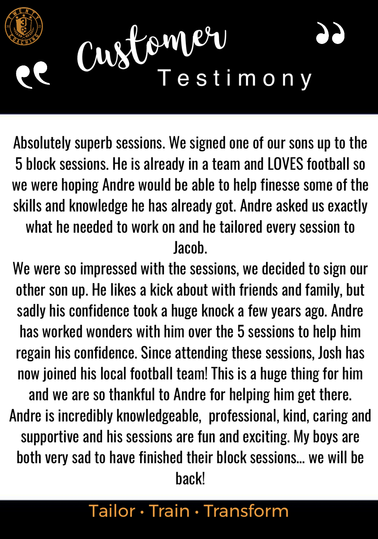 Whether that’s a new player just starting out in football and wants to build confidence in a personal session, A Player already playing for a team but wants that extra edge and added training OR a small group of friends/Team mates of similar age/ability in a tailored session for 4-6 players.